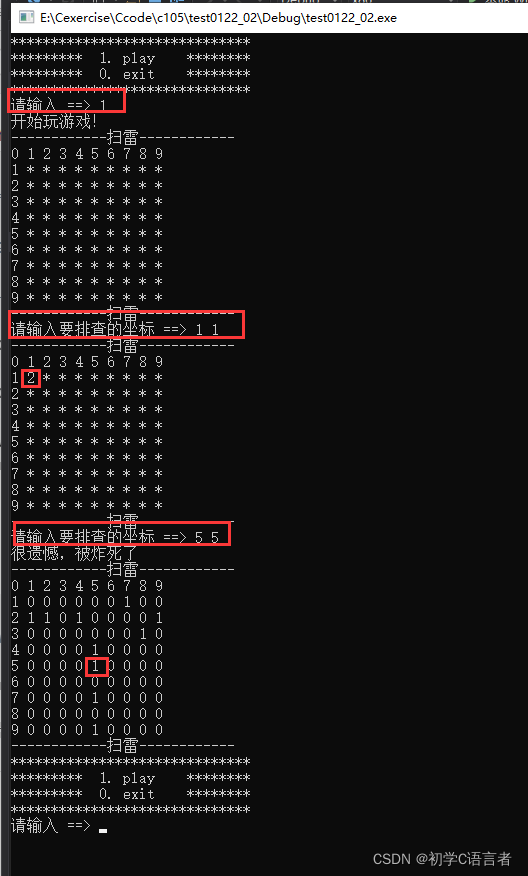 - mine数组后续放入10个雷,有雷的位置用字符 ‘1’ 表示,没有雷的位置仍然是字符 ‘0’