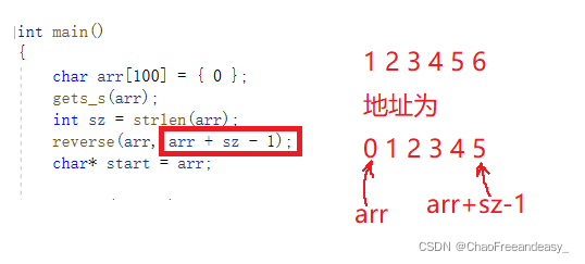 通过传址,将数组的首地址和元素的最后一个地址传到reverse函数中,通过解引用,交换其两端的值,来达到逆置字符串.
