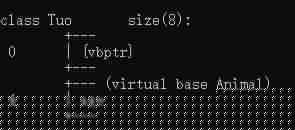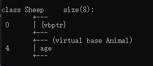 这个图就是内存结构,可以看到,SheepTuo类中分别继承了来自Sheep类的vbptr(虚基类指针)和Tuo类的vbptr(虚基类指针)。这个虚基类指针指向的是一个虚基类表,可以在图中看到虚基类表中第一项存储的是vbptr与本类的偏移地址,也就是继承过来的Sheep类中初始位置就是存放Sheep类的的vbptr,在这里为0;第二项是本类的vbptr与虚基类的公有成员之间的偏移量,也就是Sheep的vbptr和Animal类的age之间偏移为8,Tuo的vbptr和age之间偏移量为4。对于虚基类的派生类,虚基类的偏移量由实际类型决定,因此在运行时才可以确定虚基类的地址。
