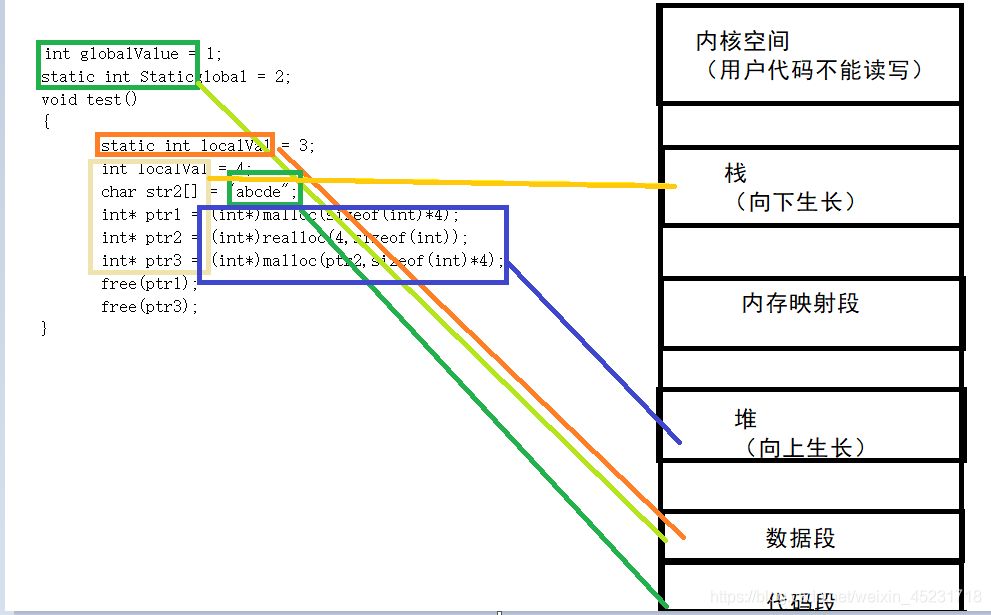 3、数据段(静态区)(static)—,全局变量和静态变量的存储是放在一块的,初始化的全局变量和静态变量在一块区域, 未初始化的全局变量和未初始化的静态变量在相邻的另一块区域。 - 程序结束后由系统释放。