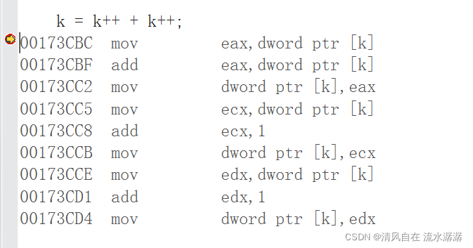 这段汇编代码简单的来说,就是先进行 + 操作,k = 2 + 2 = 4,然后进行两次 ++ 操作,所以最终结果就是 6。