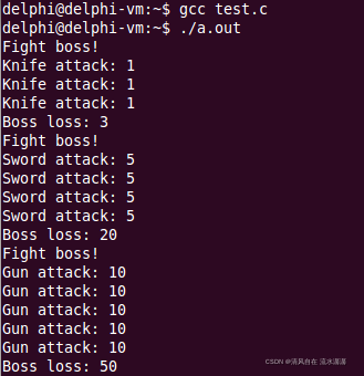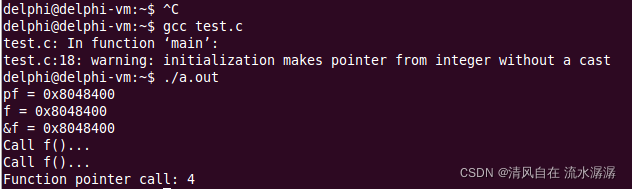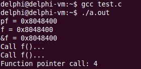 如果我们把void(*pf)() = &f; 改成void(*pf)() = 0x8048400; 直接利用函数指针跳转到 0x8048400 这个地址来执行,结果照样也能正常输出: