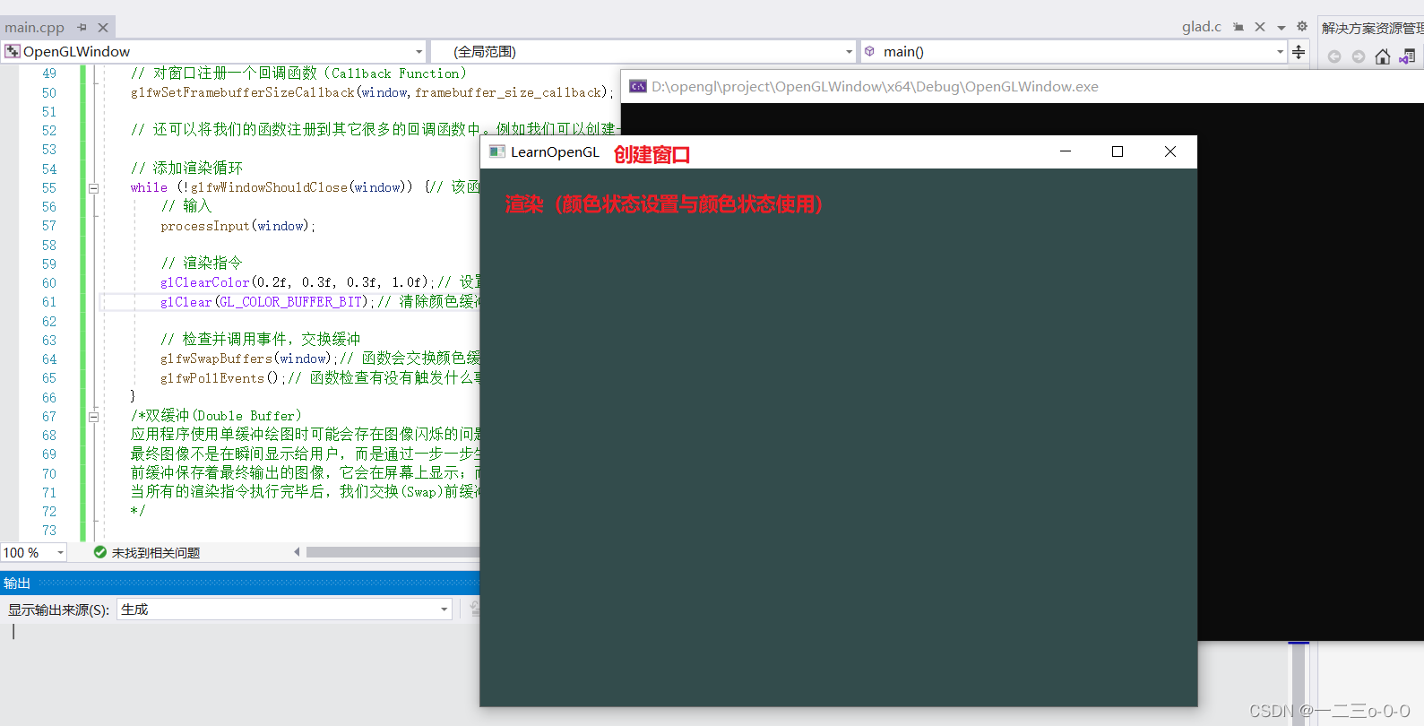 glfwSwapBuffers(window);// 函数会交换颜色缓冲(它是一个储存着GLFW窗口每一个像素颜色值的大缓冲),它在这一迭代中被用来绘制,并且将会作为输出显示在屏幕上