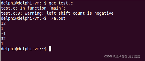 注意四则运算优先级大于位运算,所以 0x01 << 2 + 3 的结果是 32。 还有就是右操作数的范围必须为:[0,31],如果不在这个范围内,程序的输出结果由不同类型的编译器所决定,结果将不确定,就像本代码 3 << -1 一样。