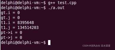 对象t1 所占用的存储空间在栈上面,而且成员变量 i 和 j 也没有明确的初始值,所以初始值就不定。对象 gt 所占用的存储空间在全局数据区,所以初始值统一为 0。