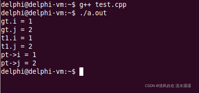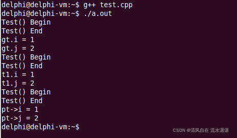 Test* pt = new Test;意味着在堆空间中生成一个 Test 对象,虽然 pt->i 和 pt->j 均为 0,这只是巧合罢了,因为在堆上创建对象时,成员变量初始为随机值。