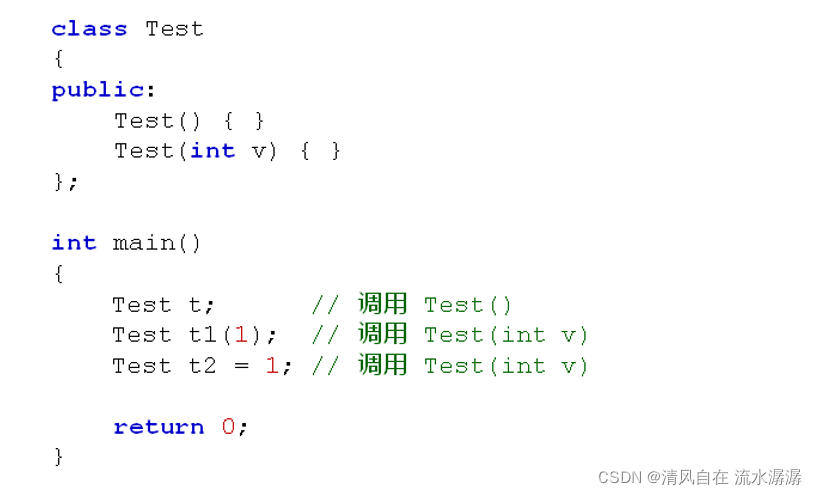 这里需要明确一个问题,int i = 1;与 int i; i = 1;的不同。前者是初始化,后者是先定义,再赋值。后者由于定义 i 时没有初始化,所以 i 的值时随机的。C语言中这两者差别很小,但是在 C++ 中两者差异很大。差别在于在 C++ 中初始化会调用构造函数。下面看一个例子,在上述代码的基础上加一行代码 t = t2;