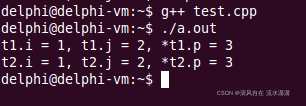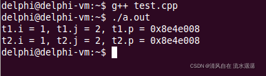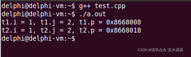 }下面为输出结果,可以到 t1 和 t2 的 p 指针分别指向不同的堆空间地址: