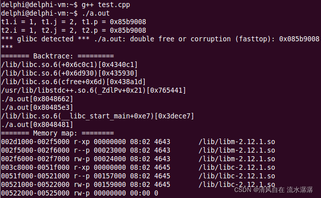 }下面为输出结果,编译能通过,但是运行时发生了错误,释放了两次堆空间的内存: