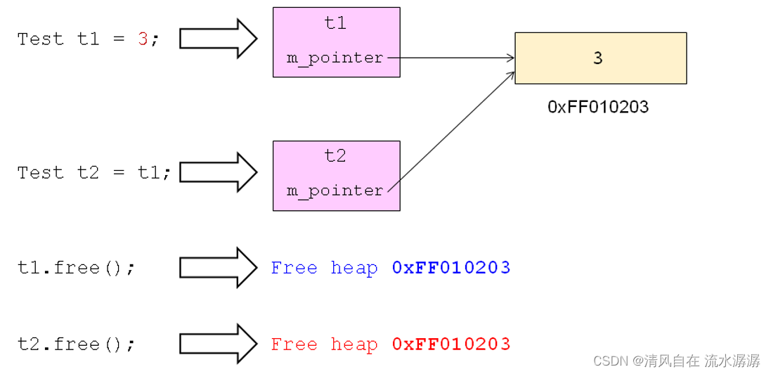 这段程序的第一个问题就是 t1 和 t2 的 p 指针都指向同一个堆空间中的地址,第二个问题就是申请了内存并没有释放,会造成内存泄漏。