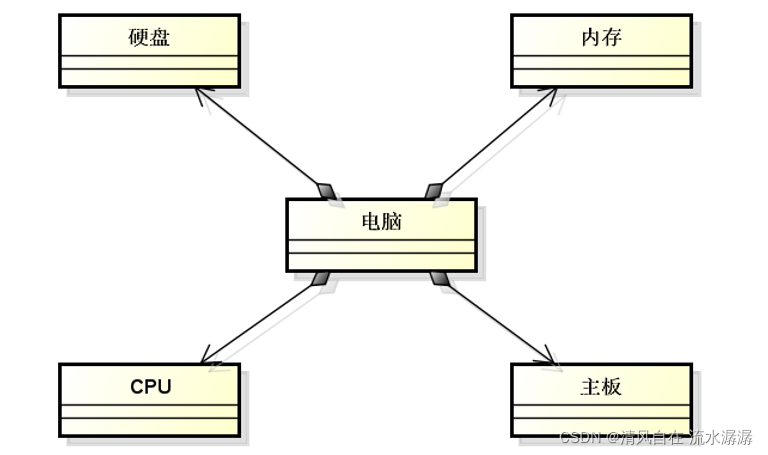 - 一些类的存在必须依赖于其它的类,这种关系叫组合