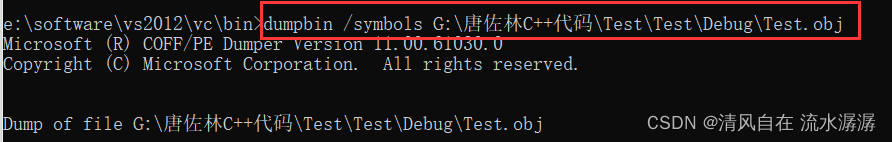 输入以下命令,其中 /symbols 后面为 Test.obj 所在的位置。