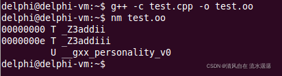}将该代码编译成目标文件,取名为 test.oo,然后通过 linux 中的 nm 命令查看 test.oo 中的东西,可以看到 test 符号表里面有两个东西 T _Z3addii 和T _Z3addiii,这就是 add 函数被编译过后的目标函数名,ii 表示两个参数, iii 表示三个参数。