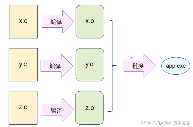 如下图所示,.o 为目标文件,链接器将不同的目标文件装配组合在一起形成一个可执行文件。