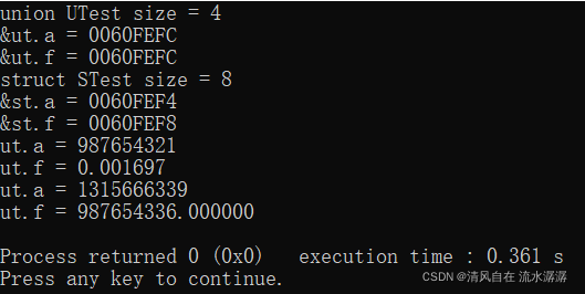 这里注意整型数据和浮点类型数据在内存中的表示方式不一样,所以在同一段内存,同是4个字节,按照整型的方式解释这4个字节的数据时是一种结果,按照浮点数类型解释这4个字节时就是另一种结果。