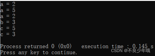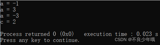 可以看到 c 输出为1,这是因为使用 goto 语句后,直接调到 FOR 标签所在的位置,导致了 for 循环没有执行。