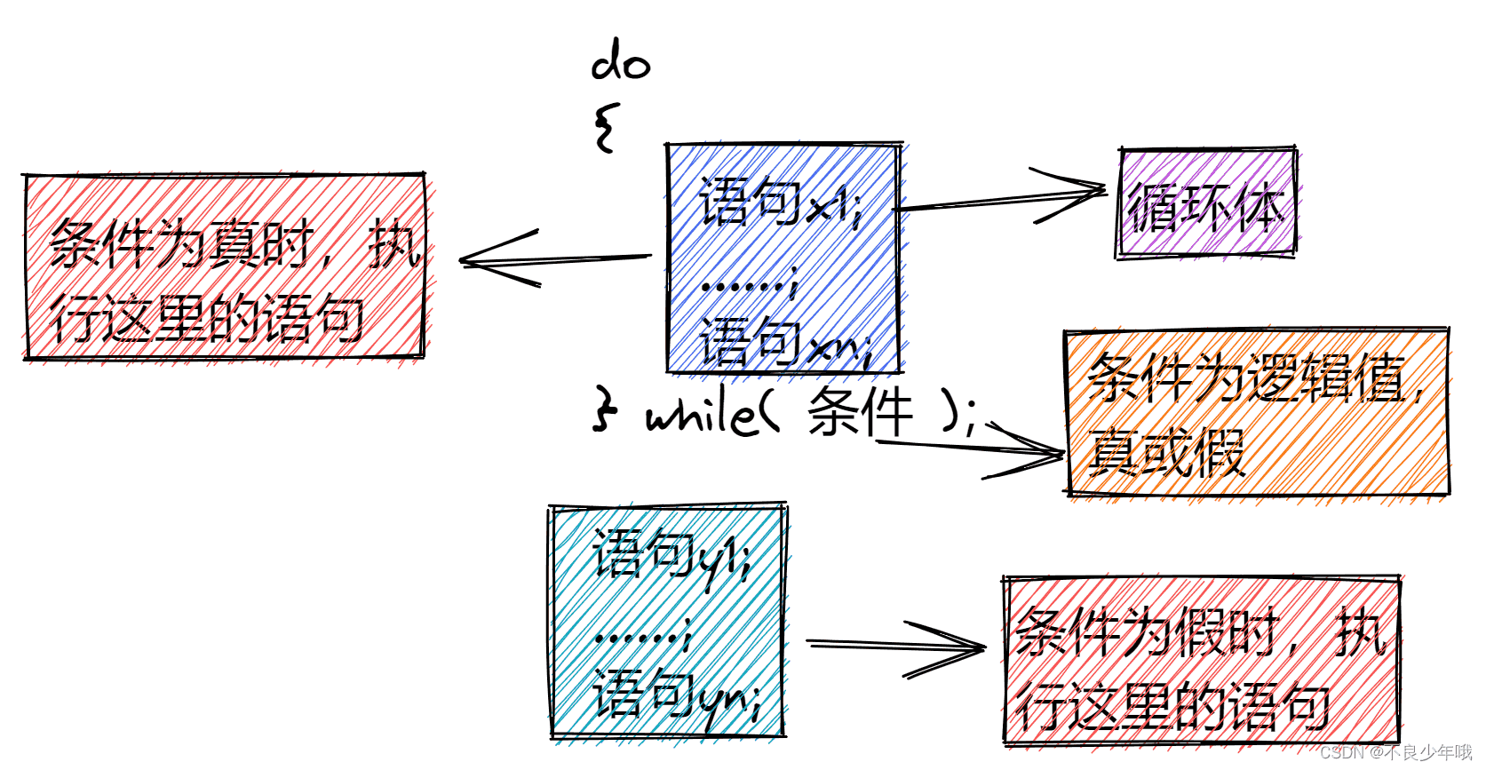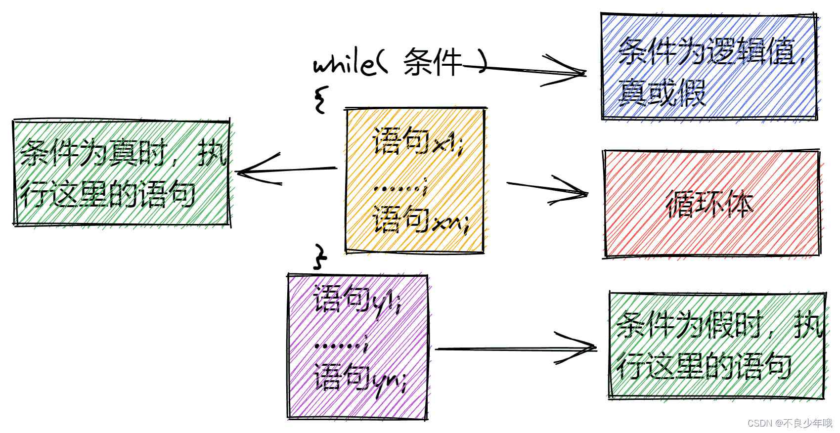 - 花括号可省略,省略花括号则循环体仅为一条语句