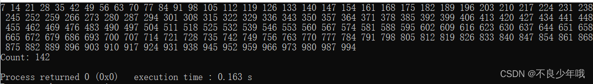 上代码,打印1000以内能被7整除的整数,并统计数量: