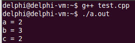 }下面为输出结果,c =FUNC(++a, b),等价于 c =((++a) < (b) ? (++a) : (b)),先执行(++a) < (b),得到 a =,2,b = 3,由于 ++a 比 b 小,所以输出 ++a,这个时候 a = 3,所以 c 也等于 3。