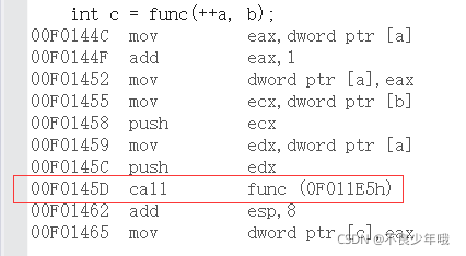 int c = func(++a, b);