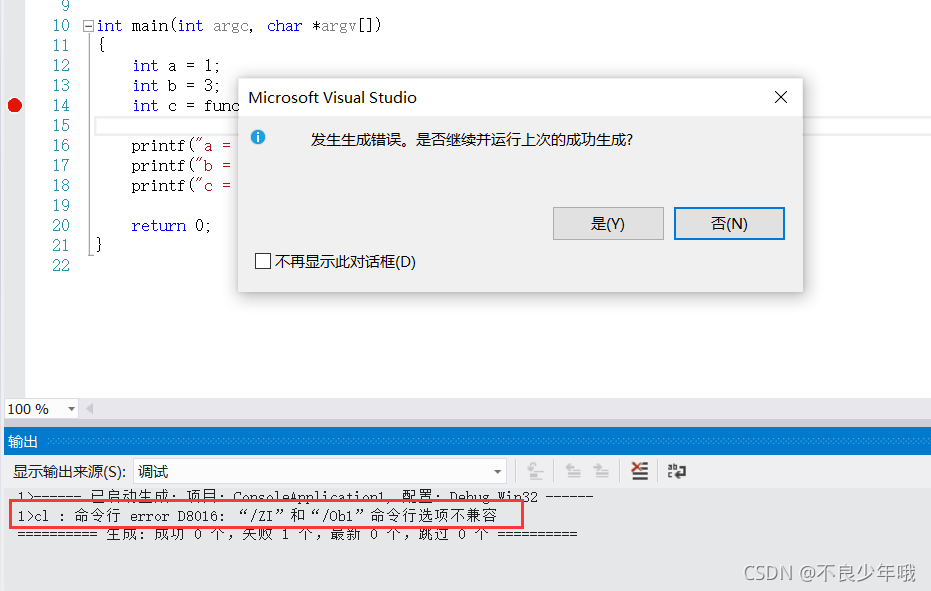配置好以后,在 int c = func(++a, b); 前面打个断点,开始跑代码,但是我跑的时候报错了。
