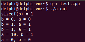 }下面为输出结果,可以看到bool类型只占用一个字节,且输出符合上面讲的理论。