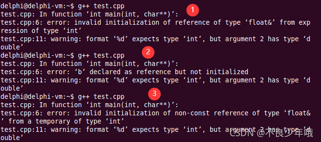 如果我们把 int& b = a; 改成float& b = a; 或者改成 float& b; 或者改成float& b = 1,则编译器分别报如下错误,这说明C++编译器对数据类型要求是非常严格的。