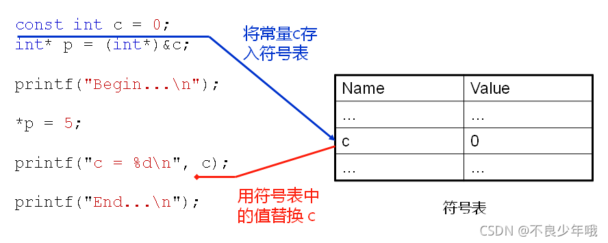- 编译过程中若发现使用常量则直接以符号表中的值替换