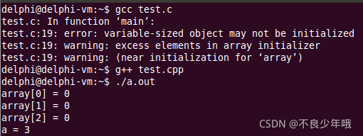 可以看到,该程序在C语言的编译环境下报错,这是因为在C语言中,const修饰的两个变量是只读变量,array[A + B]中的A+B只有在运行时才知道,所以会报错。而在C++的编译环境下,A和B是真正意义上的常量,所以编译器会到内部的符号表中取值,到array[A + B]时,编译器知道了A=1,B=2,当然不会报错了。