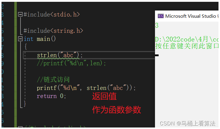当前代码,strlen()函数是作为printf()打印函数的参数,把自己的返回值3返回给了printf()函数,所以最终打印结果是:3。