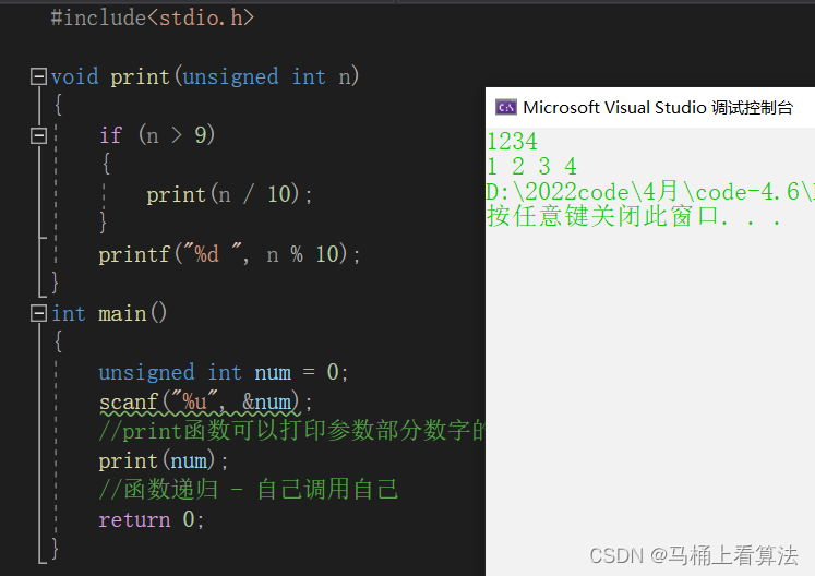 接受一个整型值(无符号),按照顺序打印它的每一位。例如,输入:1234,输出:1 2 3 4