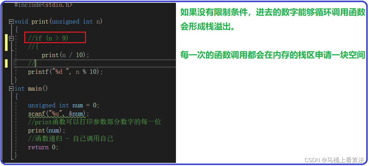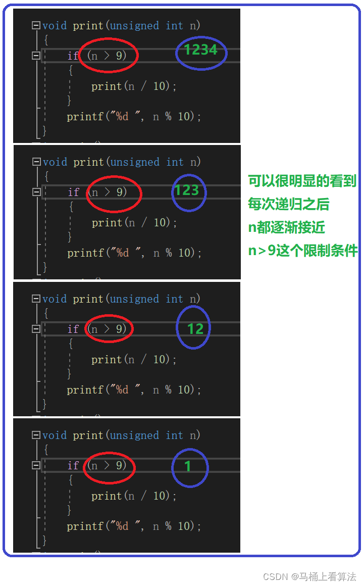 - 存在限制条件,当满足这个限制条件的时候,递归便不再继续。