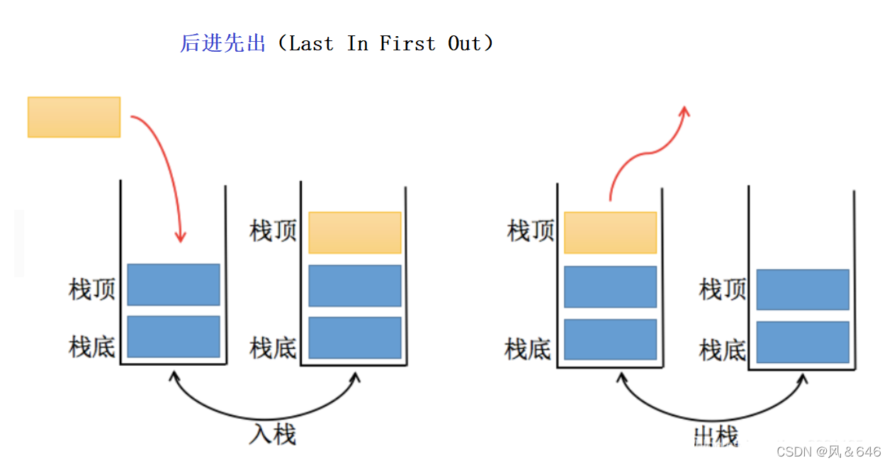 栈:一种特殊的线性表,其只允许在固定的一端进行插入和删除元素的操作。进行数据插入和删除的一端称为栈顶,另一端称为栈底。栈中的数据元素遵守先进后出LIFO(Last In First Out)的原则。
