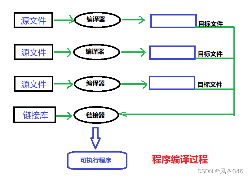- 组成一个程序的每个源文件通过编译分别转换成目标文件(object code)。