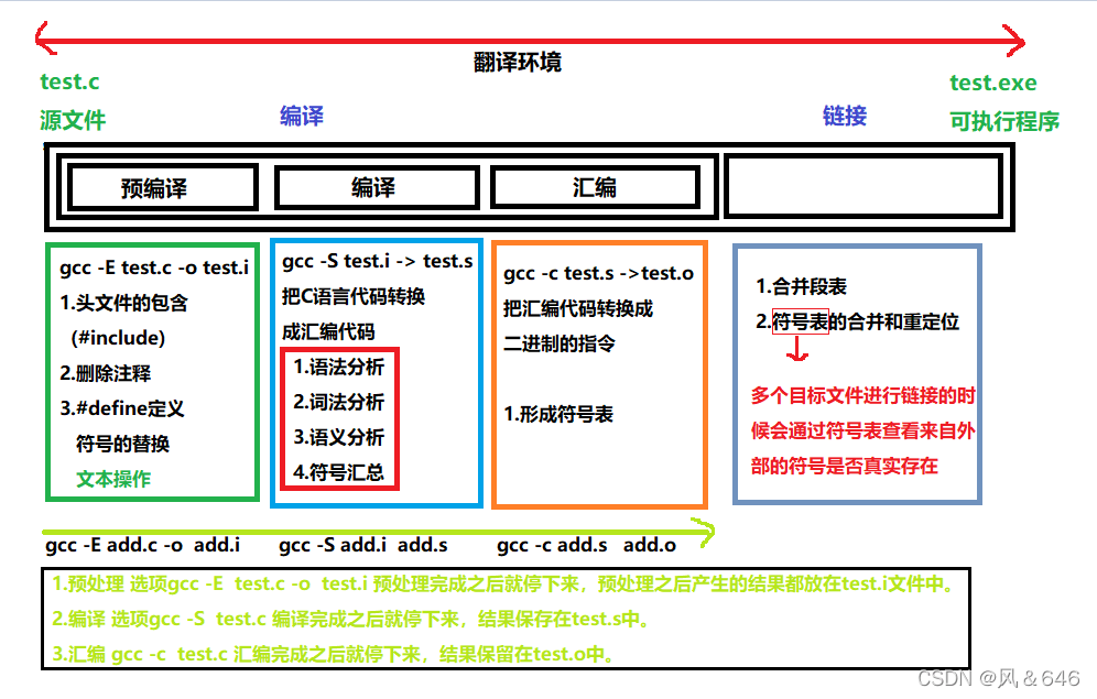 在ANSIC的任意一种实现中,存在2中不同的环境。第一种是翻译环境,负责将源代码转换成可执行的机器指令;第二种是执行环境,用于实际执行代码。一个程序从源代码到可执行程序一共会经历四个过程,分别是预处理、编译、汇编、链接,本篇