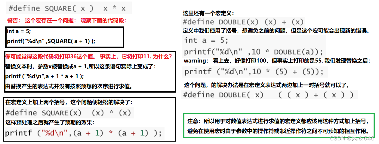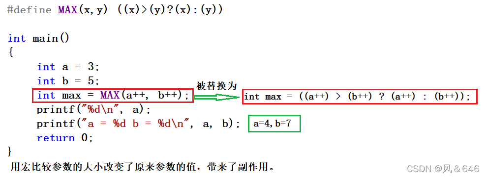 当宏参数在宏的定义中出现超过一次的时候,如果参数带有副作用,那么在使用这个宏的时候就可能会出现危险,导致不可预知的后果。副作用就是表达式求值的时候出现的永久性效果。