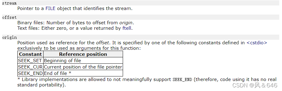 stream - 指向FILE结构的指针 offset - 起始字节数 origin - 起始位置