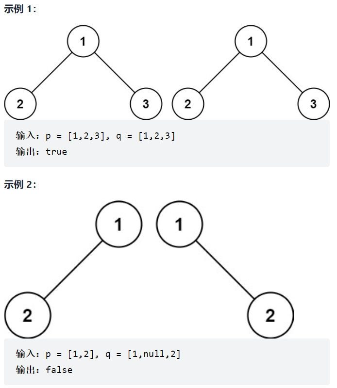 如果两个树在结构上相同,并且节点具有相同的值,则认为它们是相同的。