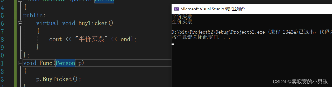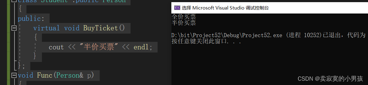 我们在反观上述中动态多态的定义,用父类的引用或者指针(这里使用的是Person& p)来接收不同类型的对象(p1和p2),该引用或指针调用相同的函数(都调用了p.BuyTicket()),都调用了各自类中不同的函数(打印的结果不同)。我们将这一过程称为动态多态。