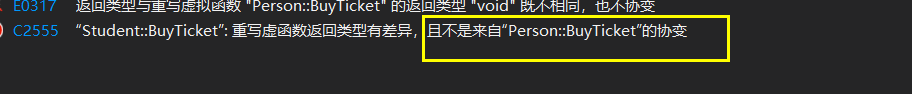 如果我们将父类和子类中的虚函数的返回值设为不同,可能会发生如下报错: