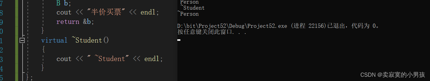 我们将上一段代码进行了改写,定义了B继承A,而在Person和Student两个类中的虚函数中将返回值分别置为A和B,由于A和B是继承关系,所以仍然可以构成多态,我们称派生类的虚函数为基类的虚函数的协变。