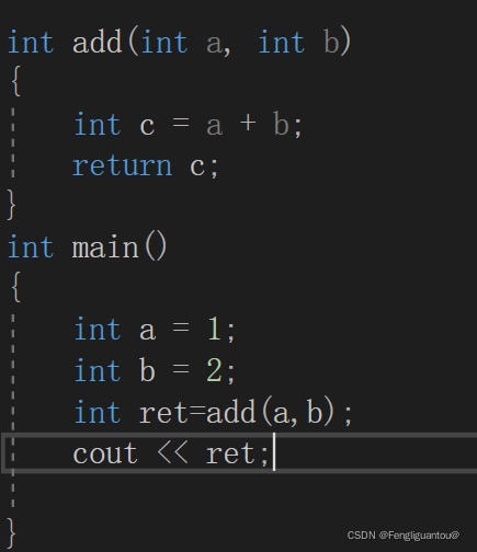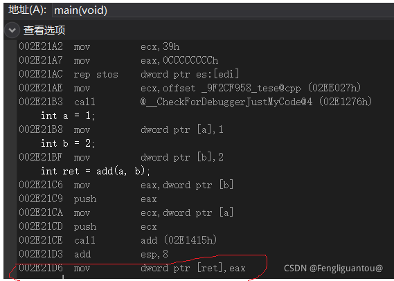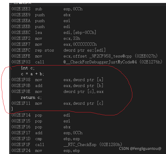 分析这段代码的汇编,在进入add函数以后,先是将a的值给了eax,然后将b的值加上a,接着将eax里的值给了c。最后对c进行返回,在返回c的时候生成一个临时拷贝,c将自己的值又给到了寄存器eax中。