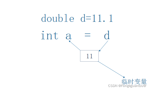 d的类型是double,a的类型是int,类型不同,正如下图所示,在发生隐式类型转换的时候,需要将d的值存到一个int类型的临时变量里,然后将这个临时变量的值赋予给a。