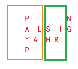 因此创建一个具有r行c列的的二维矩阵,(这里在计算列的时候需要多+一个周期,因为除法的计算会舍去余数)。一开始从(0,0)这个位置开始填写字符,通过判断i%t与r-1的大小决定向上移动还是向下移动。