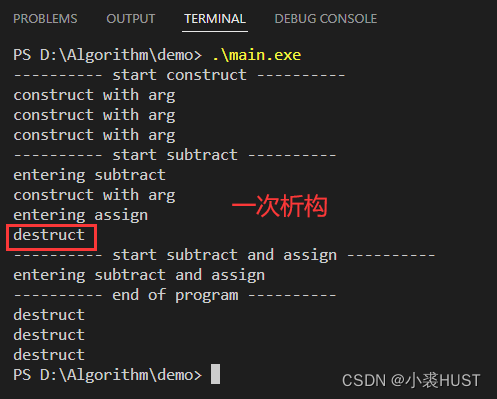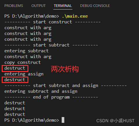 上图是在加上了“-fno-elide-constructors”编译选项后的运行结果,可以看到执行了两次析构,对应减法重载函数内的对象和拷贝构造函数生成的临时对象被析构。