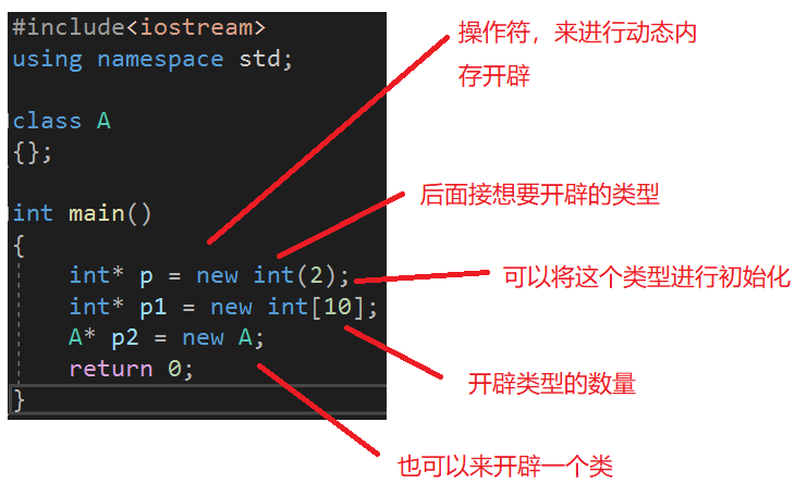 A* p2 = new A; //动态分配一个类