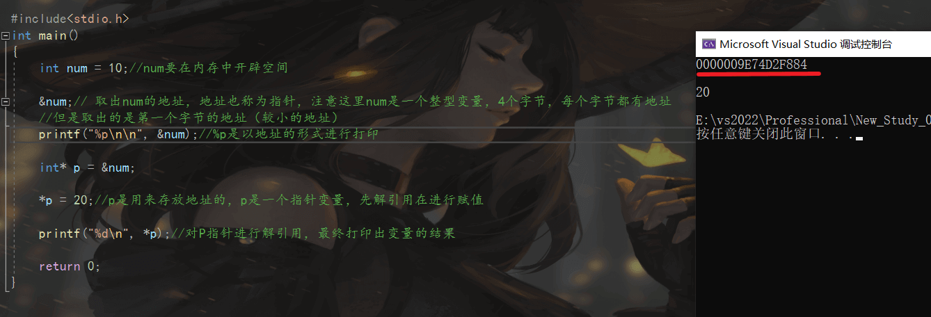 *p = 20;//p是用来存放地址的,p是一个指针变量,先解引用在进行赋值