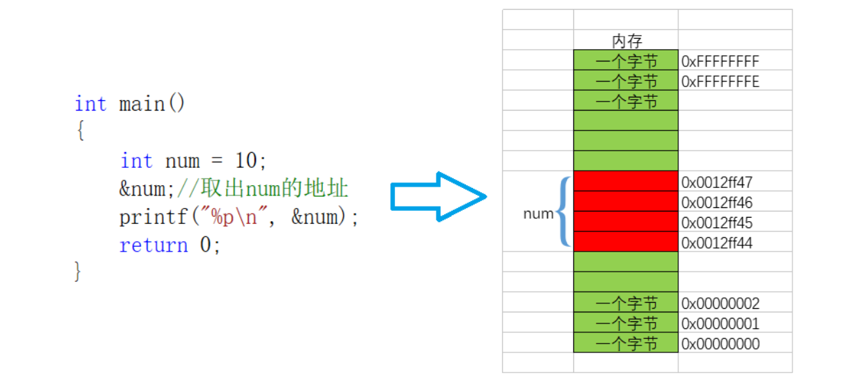 #// 取出num的地址,地址也称为指针,注意这里num是一个整型变量,4个字节,每个字节都有地址