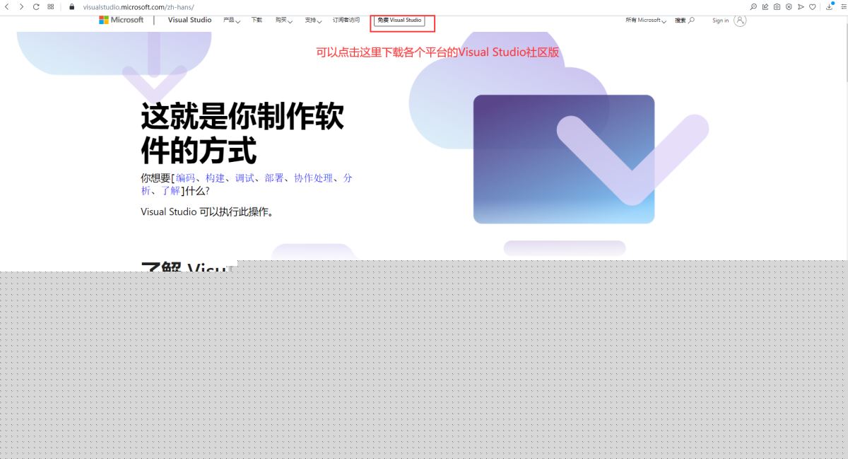 首先登陆Visual Studio官网:Visual Studio官网,界面如下所示。然后选择需要的版本:社区版(免费)、专业版、企业版。如果是个人使用,社区版就够用了,我这里下载社区版。