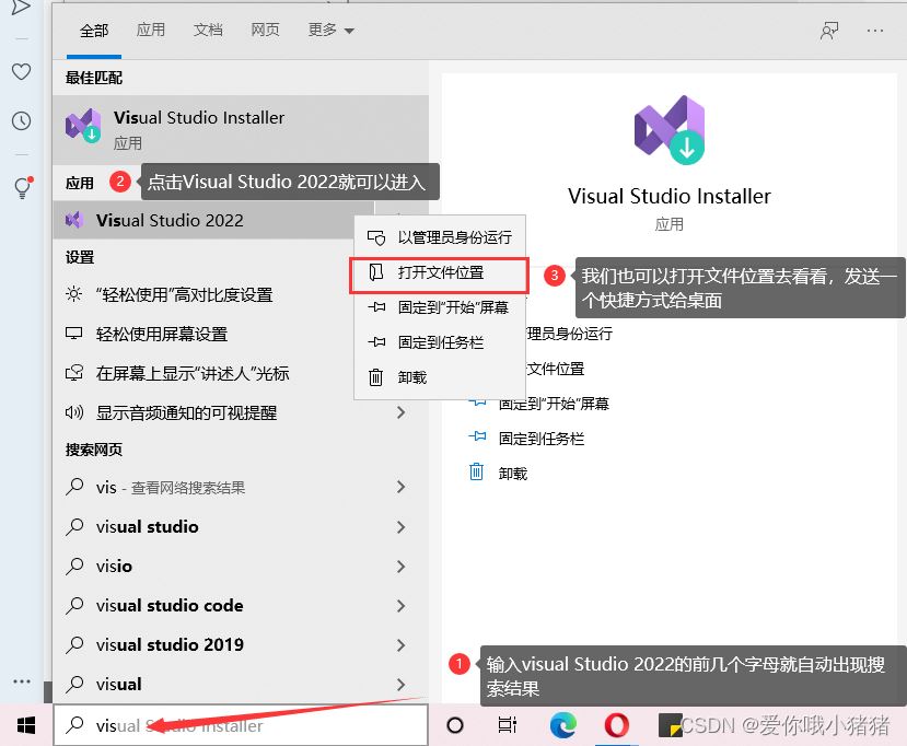 我们也可以在搜索栏输入Visual Studio 2022的前几个字母,就会出现我们安装的Visual Studio 2022,单击就可以进入。为了方便,我们可以右键点击,选择打开文件位置,将其发送到桌面快捷方式。